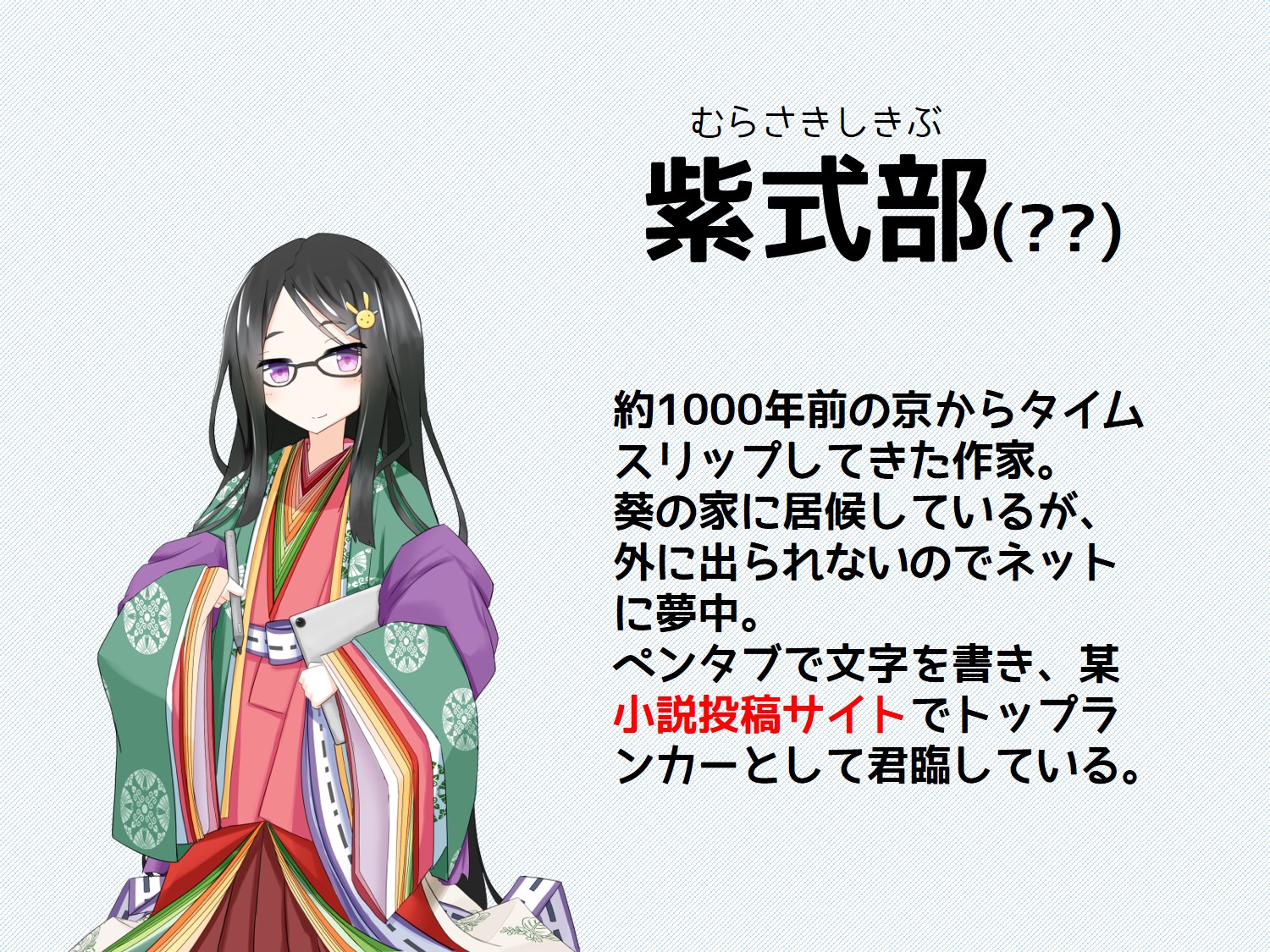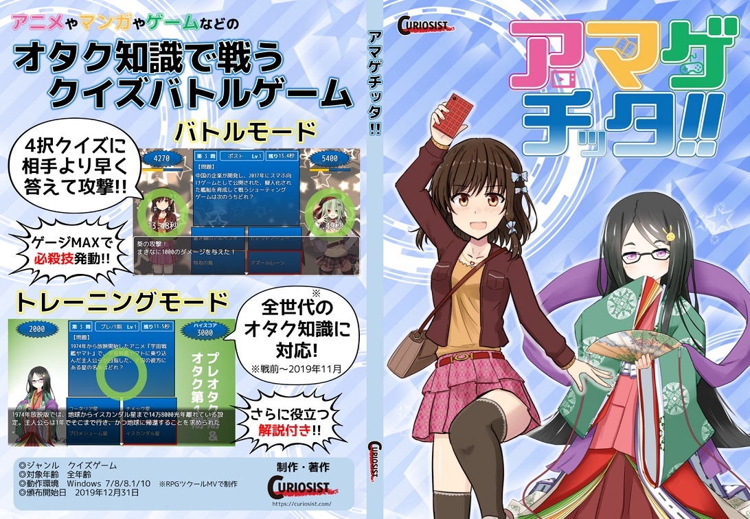 第1弾『アマゲチッタ!!』 頒布開始日:2019年12月31日(コミックマーケット97) 頒布形態:パッケージ入りのCD-ROM(有料)およびWeb(無料) (※左側の画像をクリックorタップすると、ジャケット(表面・裏面)の画像を確認できます) ROM版即売会頒布価格:500円(※自家通販価格は異なります) ROM版頒布ページ: フリー版公開ページ:ふりーむ! 出題範囲:2019年11月末まで 主人公:藤原葵と紫式部 第1弾『アマゲチッタ!!』PVはこちら(YouTube) |
